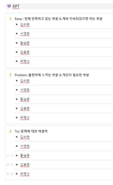 우리는 먼저 개인적으로 KPT 를 작성하고 그 중에서 공통적인 부분을 골라 전체 팀의 KPT 로 지정했다.