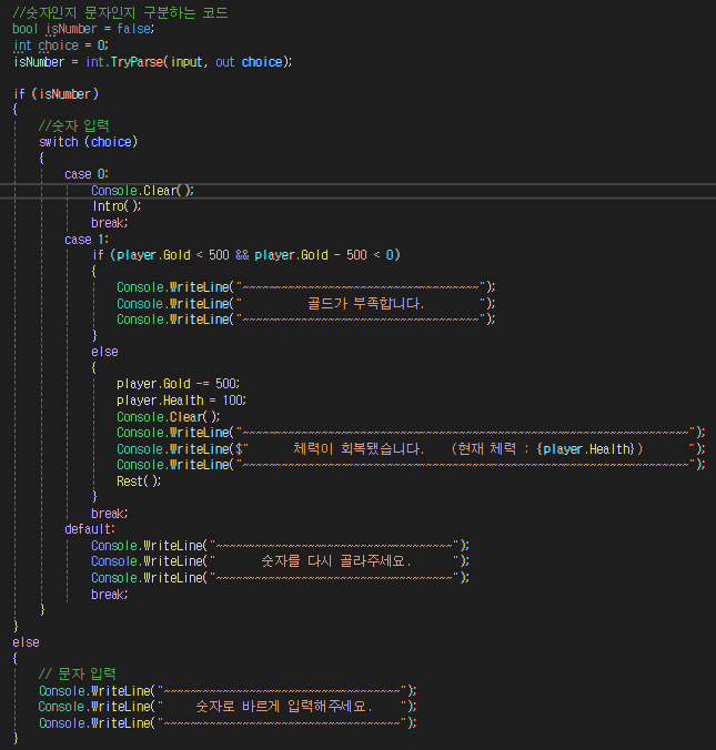 input에 플레이어가 입력한 값을 넣고 TryParse로 input이 숫자인지 문자인지 확인하여 숫자면 choice로 빼올 수 있게 했다. 빼온 값은 switch문을 내려가면서 맞는 case문에서 멈추게 했다. 이 과정은 해설 강의에서 튜터님이 하신 것과 동일했다. 하지만 튜터님은 메소드로 따로 작성해서 코드의 재사용성을 높혔다. 중복되는 코드는 항상 최대한으로 줄여야 한다는걸 모르지 않지만 막상 작업할 때는 그걸 생각하고 작성하지 못한다. 이런 부분은 피드백과 같이 많이 경험함으로서 적응해 나아가야 할 것 같다.