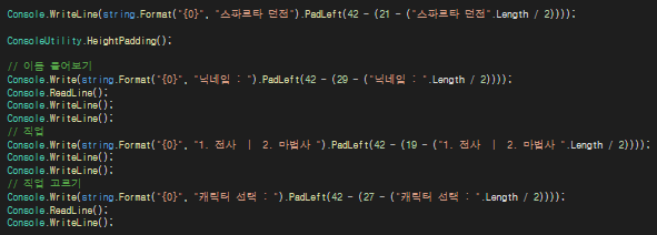 게임을 실행하고 바로 보이는 화면인 시작 화면은 위와 같이 설계를 했다. 글자가 중앙정렬이 되어야 하는데 c#은 폰트에 대한 깊은 기능이 따로 없었다. 그래서 찾아본 결과, string.Format을 이용하여 총 글자 수(중앙정렬의 기준 크기)의 절반에서 글자 수 만큼 제회하여 padleft 시키는 기능이다. 분명 이론상 중앙정렬이 되었지만 과연 미시적으로 보기 좋은 중앙정렬인가? 에는 답하기 어려울 것 같다.