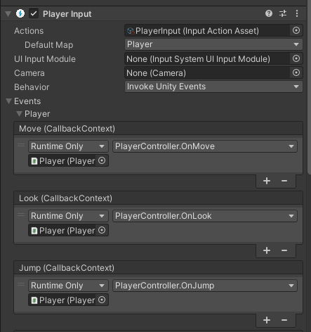 이런 식으로 원하는 행동에 대한 값을 정하고 나면 player 오브젝트에 player input 컴포넌트를 추가하고 만들어둔 inputAction을 넣어준다.
