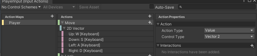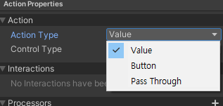 Action Type에서 만들고 싶은 행동에 맞는 키를 생성할 수 있다. 예를 들어 플레이어의 움직임은 Vector 값을 필요하기 때문에 Value-Vector2를 얻는다고 설정하고 움직이는 방향에 키를 설정한다. 또 다른 예로, 만약에 E 키로 아이템을 얻고 싶다면 Value가 아닌 Button을 선택하고 E를 지정해주면 된다.