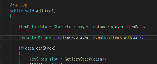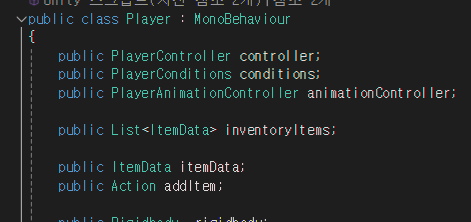퀘스트의 실패, 성공을 확인하려면 플레이어의 인벤토리에 어떤 아이템이 있는지 알아야 했다. 하지만 그 전 구현은 그냥 UI 아이템 슬롯에 아이템을 넣고 마는 것이었다. 물론 아이템 슬롯을 돌려서 아이템을 확인하는 방법이 있었지만 다른 게임에서는 인벤토리 리스트를 만들어 저장하는 것이 기본이기 때문에 그렇게 작업을 했다. 플레이어에 아이템 데이터 리스트를 생성하고 아이템을 획득할 때 리스트에 저장되게 했다. 분명 더 좋은 방법도 있었겠지만 시간에 쫓겨 뇌의 아웃풋을 그대로 적을 수 밖에 없었다.