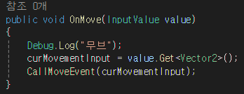 Send Message는 inputValue로 값을 받아오는데 이 값에는 우리가 지정했던 action type이 적용되어 있다. OnMove에는 Vector2 값이 지정되어 있기 때문에 우리가 받아올 때도 Vector2 받아와야 한다.